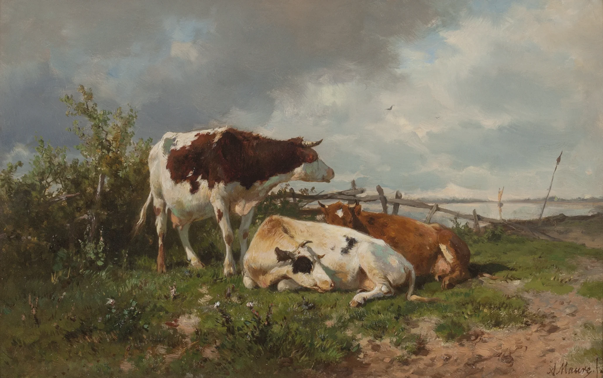 Mauve began his studies in Haarlem with the animal painter Pieter Frederick van Os from 1854-1857 and in 1858 with Wouterus Verschuur, famous for his paintings of horses. The summer of 1858 was spent with the painter Paul Gabriël in Oosterbeek, and proved to be the first of many visits. In Oosterbeek, called the Dutch Barbizon, he received further instruction from Johannes Bilders, who instilled in Mauve a deep appreciation of nature as he began to paint outdoors. Here was where he also formed a lasting bond with the artist Willem Maris, influenced by his brushwork, coloration, and most importantly his love of cows.[2]